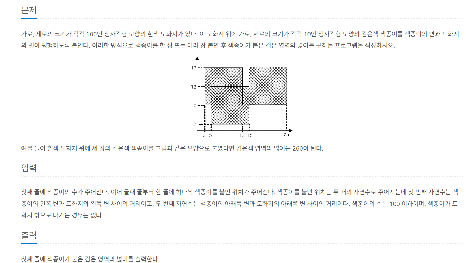해당 문제는 총 100x100의 크기의 도화지에 색종이를 붙인다고 할때, 색종이가 붙어 있는 영역의 전체 넓이를 구하는 문제이다.