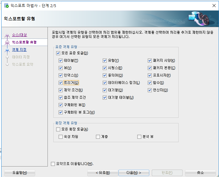 Export를 원하는 객체 유형을 선택하고 다음으로 넘어가면 된다.