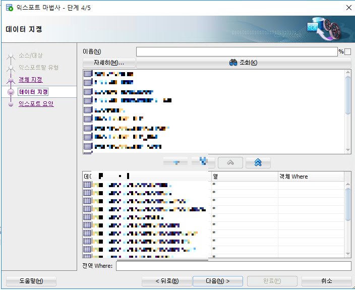 중앙의 화살표로 Export할 객체를 올긴 후 필요시 열 항목에서 옮기고 싶은 열만 지정할 수도 있고 Where을 통하여 필터처리도 가능하다.