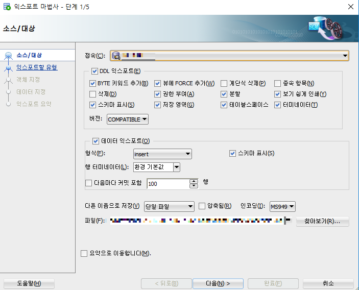 - 유형 파일 : 테이블, 인덱스, 제약사항 등 유형별 파일로 생성 스크립트를 만들어 준다. 데이터는 테이블 별로 별도의 파일에 생성된다.