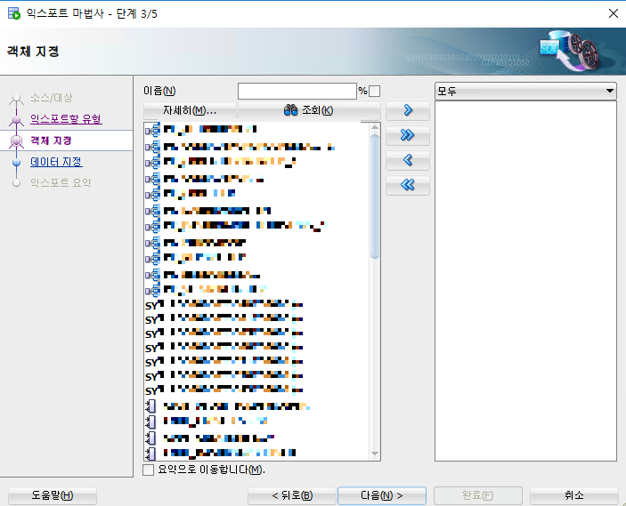 여기서 나오는 객체는 앞서 선택한 유형에 해당하는 객체유형만 나타나며 여기서 Export를 원하는 객체를 선택하여 중간의 화살표 버튼으로 우측으로 옮기면 해당 객체만 Export 할 수 있다.