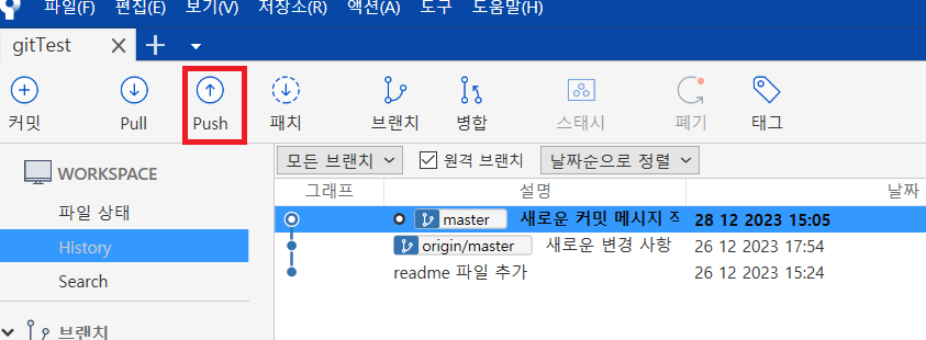 Push는 더 간단한데 리본 탭에 있는 푸시버튼을 누르기만 하면 된다.