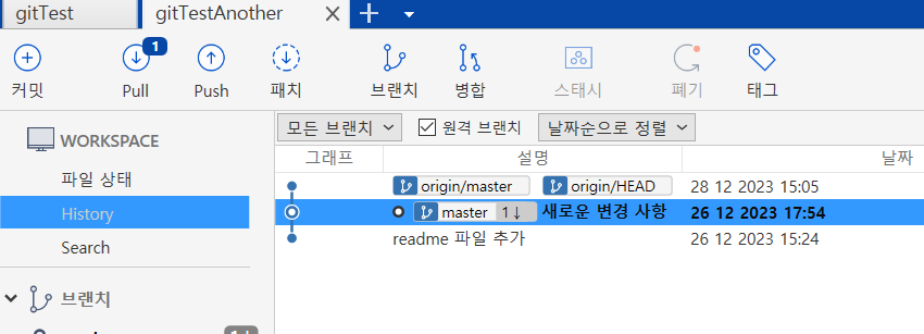 그런데 지금 GitTestAnother에서는 2개의 Commit만 보이고 로컬과 원격 저장소가 같은 위치에 있는 것으로 표시된다.