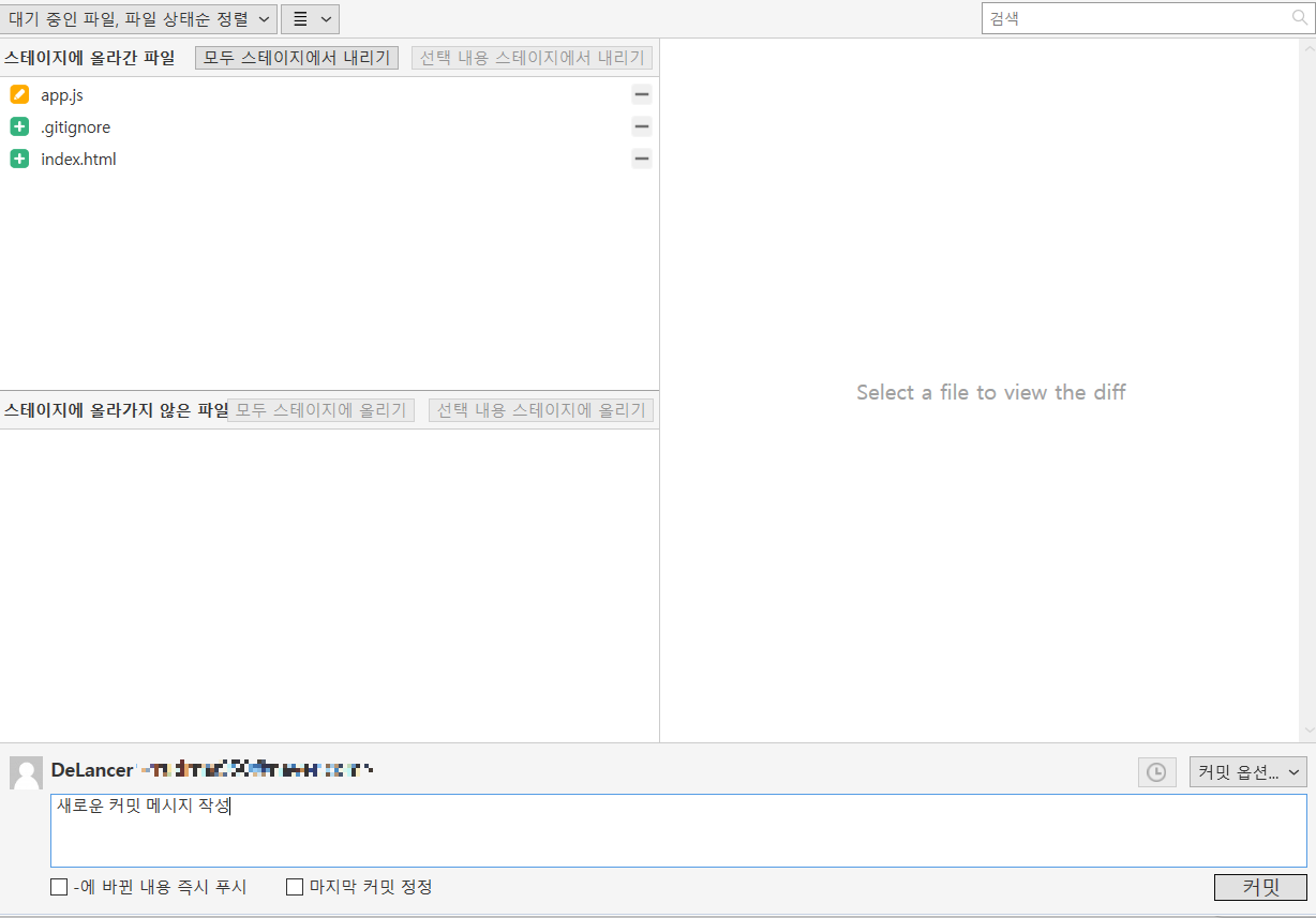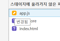 하단 목록에는 우리가 파일을 변경하였지만, 아직 커밋되지 않은 파일의 목록이 나타난다.