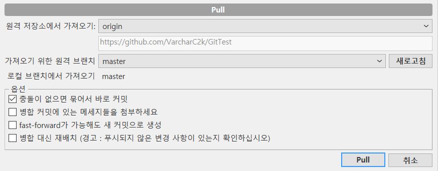 가져올 원격 브랜치와 몇가지 옵션들이 있는데 대부분 충돌이 발생했을때에 대한 옵션이라고 생각하면 된다.