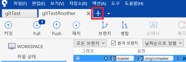 사용자를 추가하기 위하여 리본탭 상단의 +버튼을 누르고 우리가 이전에 만들어 주었던 GitTestAnother 폴더를 로컬 저장소로 지정해주었다.