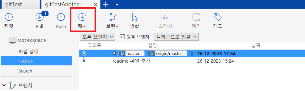 리본 탭의 패치를 누르면 원격 저장소의 상태를 로컬로 다시 내려받을 수 있다.