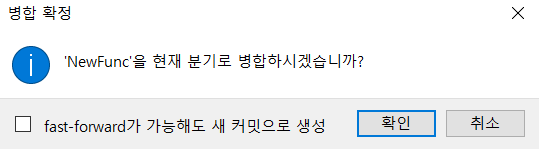 현재 우리는 Master와 NewFunc라는 Branch가 있으며 NewFunc의 작업이 끝나 master로 병합을 진행한다고 가정한다.