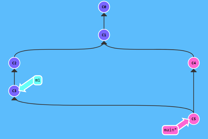우리는 C1에서 m1 Branch를 생성하고 기능 개발을 하여 C3인 시점에서 병합을 진행하고자 한다.