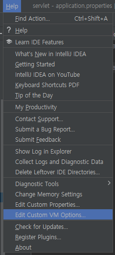 우선 리본 탭의 help에 보면 Edit Custom VM Options... 로 들어간다.