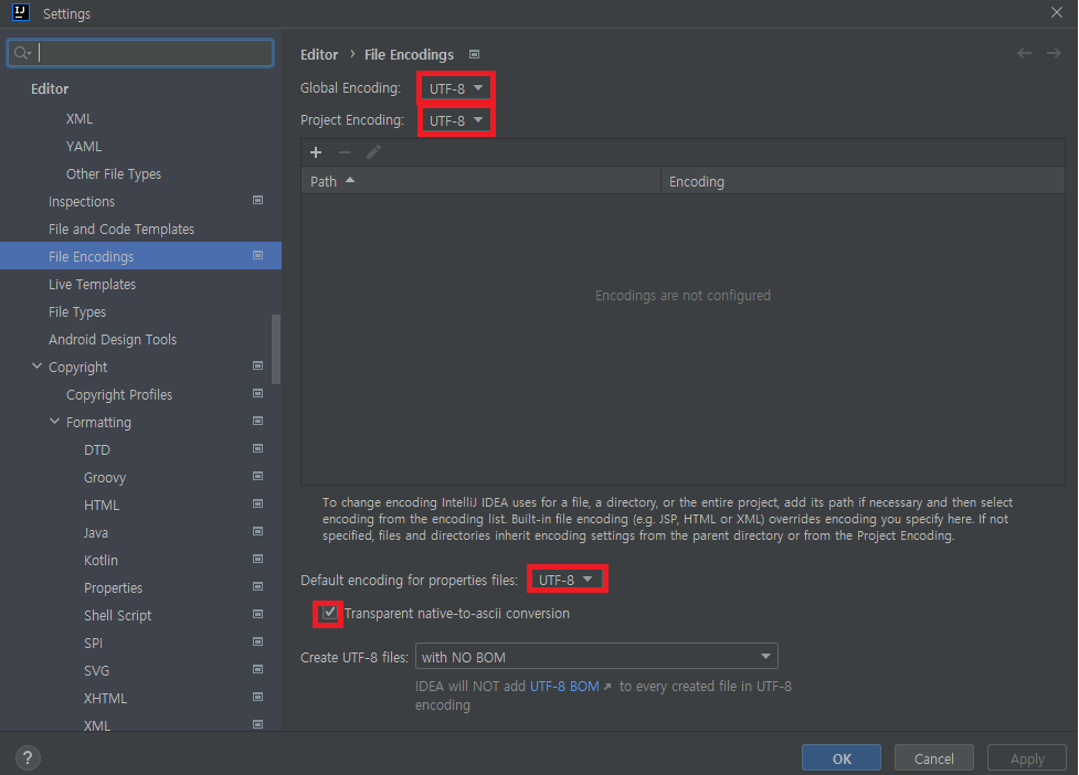 다음으로 IntelliJ의 파일 인코딩 방식을 변경하였다.