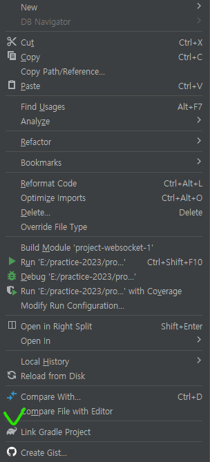 해결 방법은 단순한데 build.gradle에서 우클릭을 하면 Link Gradle Project 라는 버튼을 확인할 수 있다.