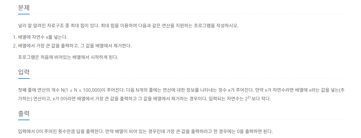 이번 문제는 최대 힙을 이용하여 배열에서 가장 높은 값을 출력하고 제거하는 프로그램을 만드는 것이다. 문제를 풀기위해서는 먼저 최대 힙에 대해서 알고 있어야 하는데, 자바에서는 우선순위 큐라는 것을 이용하여 비슷한 형태를 만들 수 있다. 최대 힙에 대해서 궁금하다면 잘 정리된 글이 있으니 참고하기 바란다. https://innovation123.tistory.com/111 [JAVA/자료구조] 힙(Heap), 최소 힙(Min Heap), 최대 힙(Max Heap) 힙(Heap) 힙은 완전 이진트리 형태로 최대, 최솟값을 빠르게 찾아내는데 유용한 자료구조이다. 힙은 중복값을 허용한다. 부모-자식 간 (레벨 별) 정렬은 보장하고, 형제간의 정렬은 보장하지 않아 innovation123.tistory.com ..